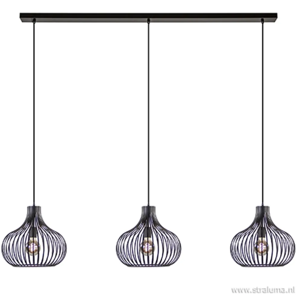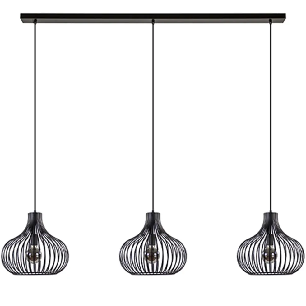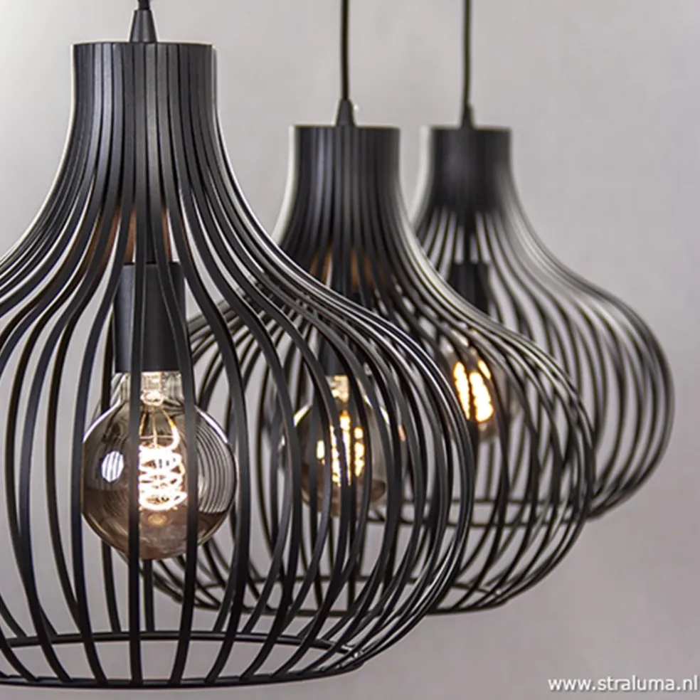 Een sfeervolle 3-lichts hanglamp die prima geschikt is voor boven een lange tafel. De drie kappen zijn gemaakt van een metalen frame die bestaat uit losse speilen en bovenaan de kap samen komen tot één geheel. De kappen zijn van onder open en hangen aan een zwart stofomwonden snoer die in hoogte is te verstellen. De mat zwarte draadlamp wordt aan het plafond opgehangen met een lange balk van 150 cm. Deze ‘zwarte’ hanglamp brengt met de juiste lichtbron een gezellige sfeer in huis en past mooi in een modern of scandinavisch interieur.