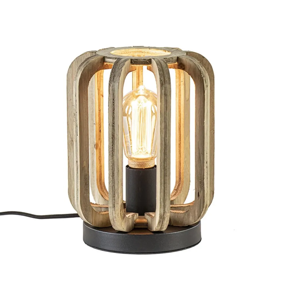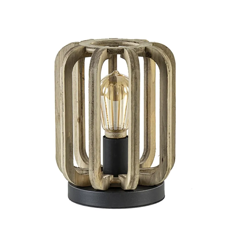 Een leuke sfeermaker voor in een kast of op een bijzettafel. Deze kleine tafellamp heeft een stoer karakter die mooi is te combineren in een industrieel of landelijk interieur. De houten kooi heeft een ruwe afwerking die is gecombineerd met een mat zwarte voet en fitting. De combinatie van de materialen is perfect uitgevoerd en maakt een mooi geheel. De houten tafellamp is voorzien van een zwart stof omwonden snoer met een lengte van 150 cm. De knipschakelaar bevindt zich op 40 cm in het snoer. De industriële tafellamp houten kooi met mat zwart wordt geleverd zonder lichtbron. Een decoratieve bron past mooi in de open kooi.
