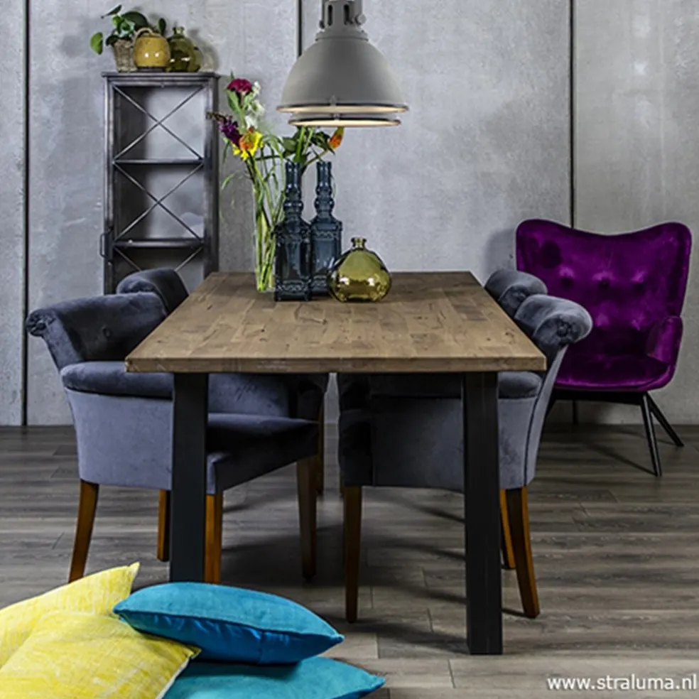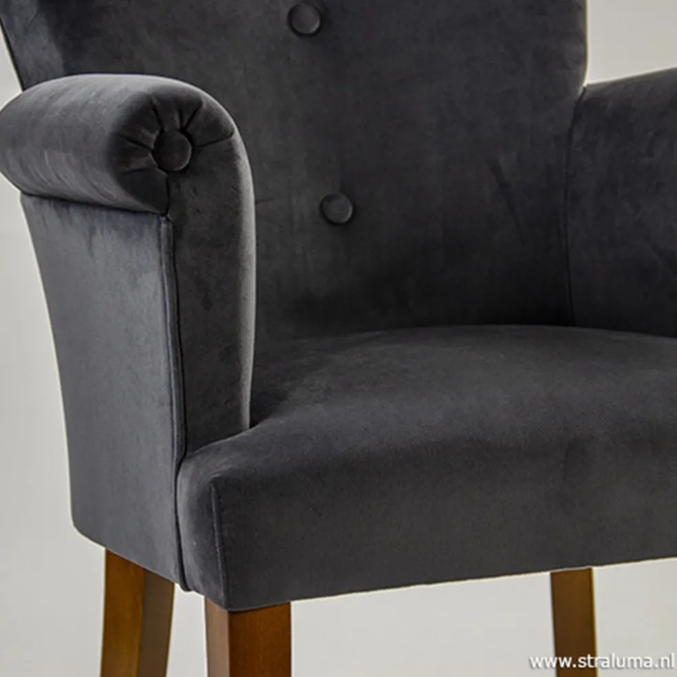Deze prachtige klassieke eetkamerfauteuil combineert een trendy stofkeuze (fluweel) met een klassiek design. Deze strak klassieke eetkamerstoel heeft een stevige, comfortabele zit. De aangename armleuningen en de rugleuning zijn afgewerkt met een stofknoop. De stoel heeft strakke lijnen gecombineerd met zachte rondingen. De poten van hout (kersen) zijn strak vormgegeven. Met deze eettafelstoel bent u verzekert van jarenlang zitcomfort.