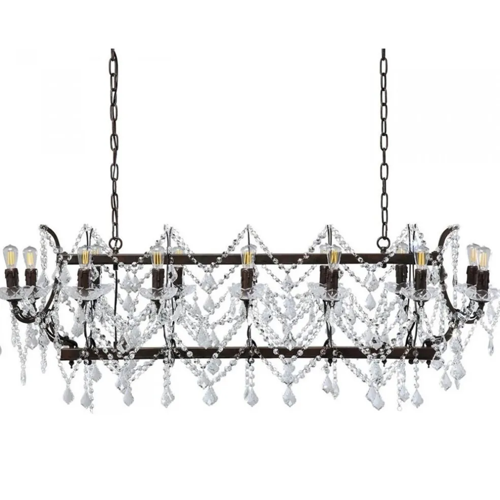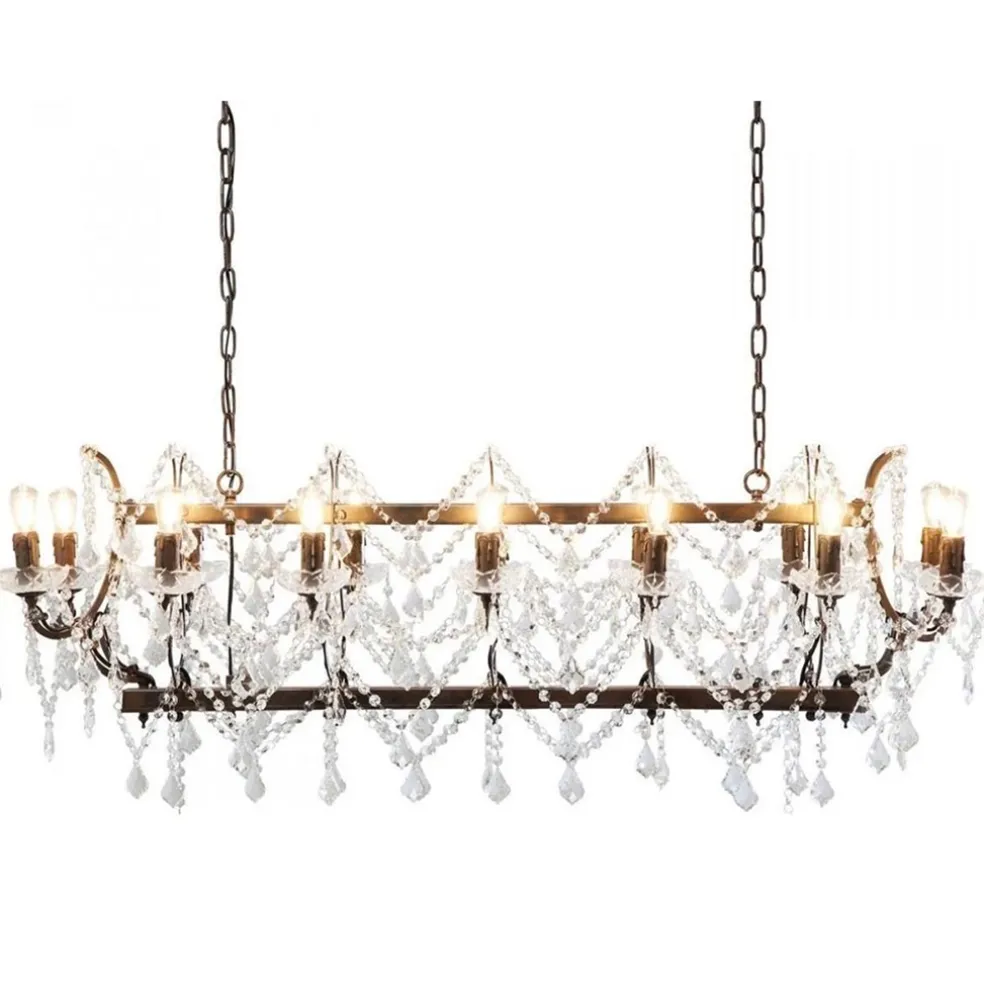 Een mooie eye-catcher voor boven een eettafel. Deze klassieke hanglamp bestaat uit een metalen frame waar 14 lichtpunten op zijn verwerkt. De lamp doet denken aan een kroonluchter en is ook op dezelfde wijze versiert met kristalglas. De kristallen pegels zijn verbonden met kleine ringetjes die samen een ketting vormen. De lichtpunten hebben een koper, roest-achtige kleur en zijn afgewerkt met glazen schoteltjes. De grote hanglamp hangt aan twee stevige kettingen die naar wens zijn in te korten. De klassieke lamp wordt met een kleine plafondbalk opgehangen in dezelfde kleur als de ketting en het armatuur. De hanglamp is een mooie nieuwe vertaling van de klassieke kroonluchter.
