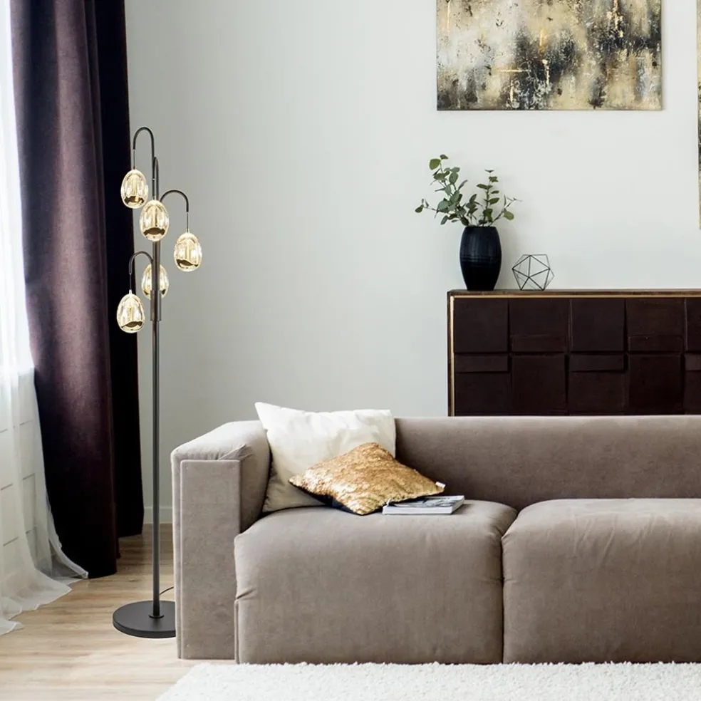 Een sfeervolle toevoeging voor in de woonkamer. De 5 kapjes zijn gevormd als een ei en voorzien van LED verlichting. De kapjes zijn deels van massief glas en deels goudkleurig metaal. Het frame is mat zwart. Dit geeft de vloerlamp een luxe uitstraling. Het glas is voorzien van luchtbelletjes wat de vloerlamp een speels effect geeft. De verlichting geeft direct licht naar beneden door middel van de spot onderop het ei, en daarnaast ook indirect licht doordat het ei van binnenuit verlicht wordt. Deze vloerlamp is gemakkelijk te dimmen met de bijgeleverde dimmer. De dimmer van de lamp bevindt zich op 90 CM van het armatuur.