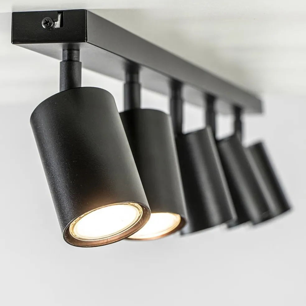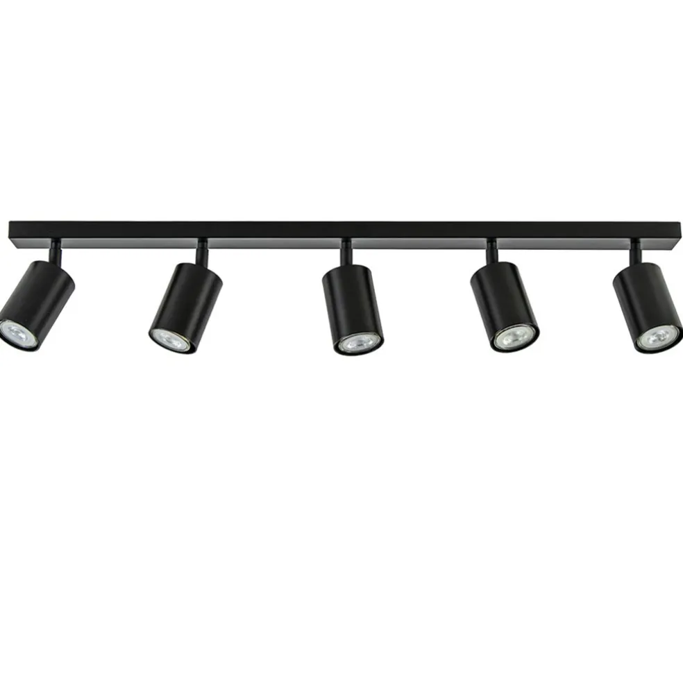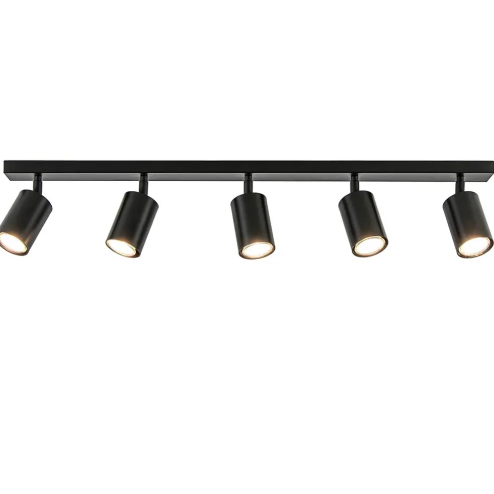Heeft u een lange hal of kamer? Dan is dit de ideale lamp om de ruimte goed uit te lichten. Deze 5-lichts opbouwspot heeft een strakke moderne afwerking en past gemakkelijk in diverse woonstijlen. De langwerpige plafondspot is gemaakt van metaal en uitgevoerd in het mat zwart. De cilinder vormige spots zijn naar wens te verstellen door deze te draaien en/of te kantelen. Zo kunt u ze gemakkelijk verstellen en zo de ruimte op de beste wijze uitlichten. De 5 spots zijn bevestigd op een smalle balk van 80 cm die net als de spots in het mat zwart is afgewerkt. De moderne opbouwspot wordt geleverd zonder lichtbron (5x GU10) en is dimbaar middels een externe dimmer (exclusief).