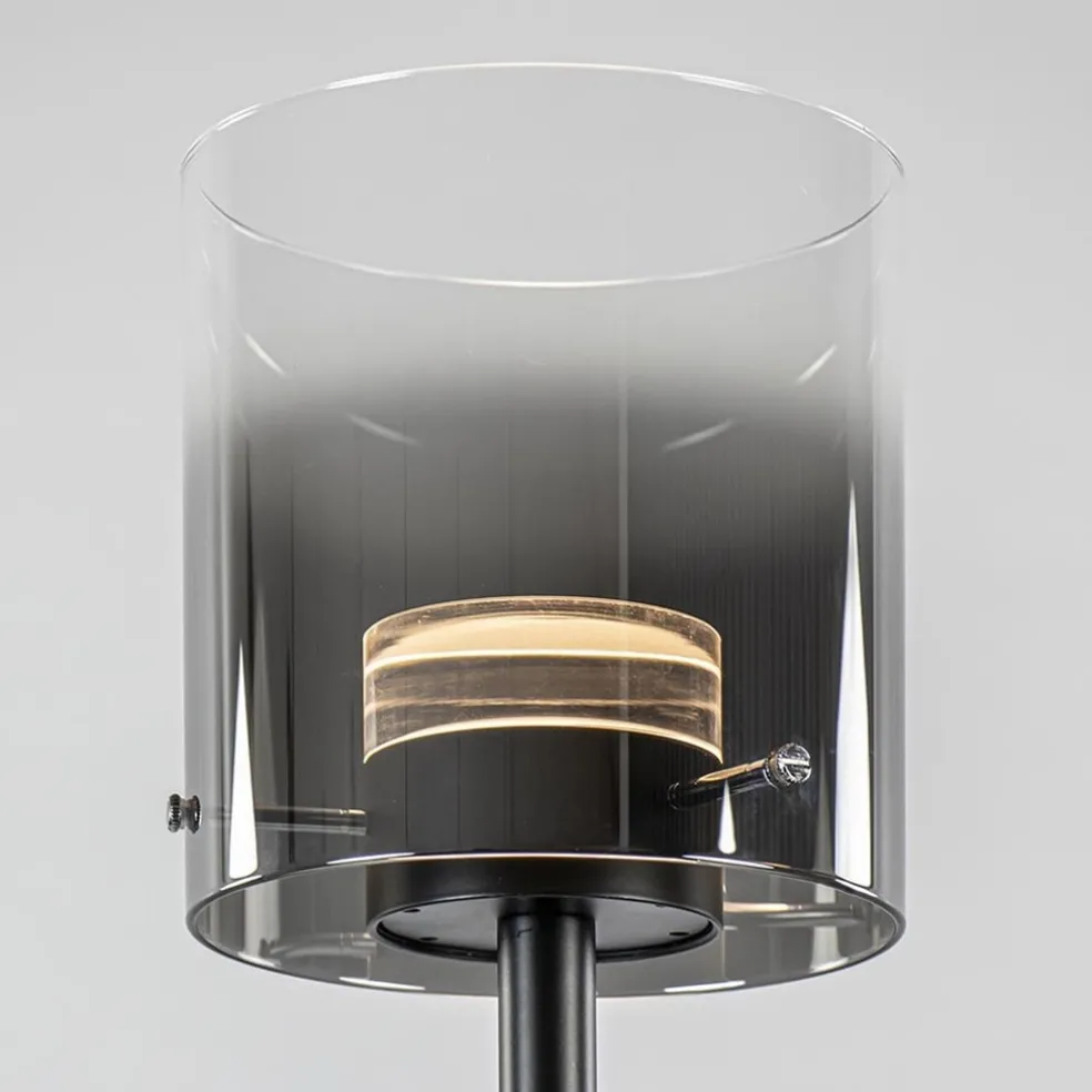 Een moderne vloerlamp met een luxe en chique uitstraling. De staande lamp is voorzien van LED en is daardoor energiezuinig. De LED vloerlamp bestaat uit een mat zwart armatuur en een glazen kap. De cilinder-vormige kap is voorzien van een verloop van titanium/smoke naar helder glas. Dit geeft de vloerlamp echt die luxe uitstraling die mooi is te combineren in een strak klassiek, modern of chique interieur. De LED staande lamp heeft een zwart snoer met een lengte van 230 cm, en een vloerdimmer op 70 cm van die ronde voet. Een mooie sfeervolle toevoeging aan het interieur.