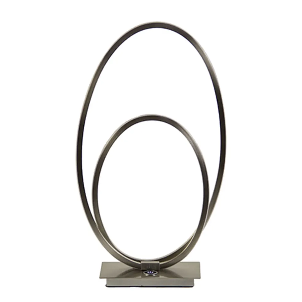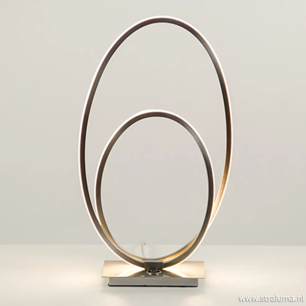 Een moderne LED tafellamp met touchdimmer. De metalen tafellamp in kleur nikkel is op de voet voorzien van een touchknop die drie dimstanden kent. De bogen van de lamp zijn volledig voorzien van LED strips wat een mooie sfeervolle verlichting geeft en ook nog eens energiezuinig is. Een ideale sfeermaker met modern design!