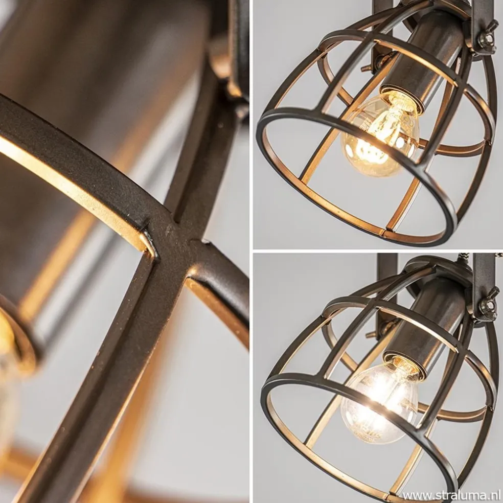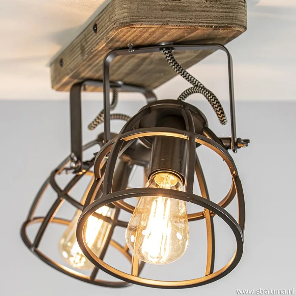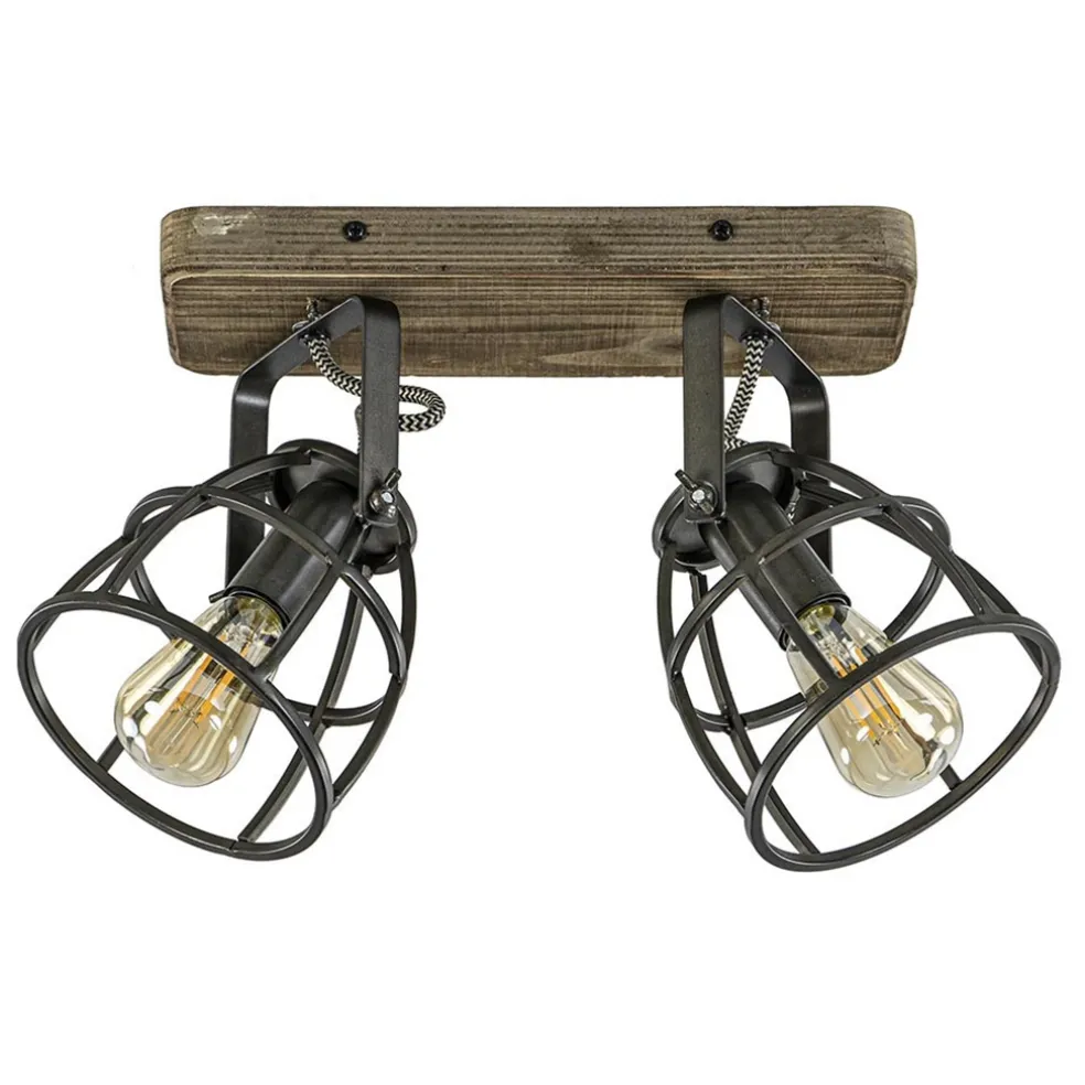 Een super leuke toevoeging voor een hal, keuken of slaapkamer. Deze 2-lichts plafondlamp is voorzien van zwart metalen korfjes en een houten plafondbevestiging. Het hout en het zwarte metaal combineren perfect bij elkaar en geven de plafondlamp een stoere landelijk industriële look. Het hout heeft een robuuste uitstraling en het metaal een grove afwerking zoals bij de lasnaden zichtbaar is. Beide korfjes zijn los van elkaar te verstellen door deze te draaien en te kantelen. De korfjes zitten aan de houten bevestiging vast met een metalen beugel. De stoere look van de plafondlamp is afgemaakt met een zwart/bruin strijkijzersnoer. De 2-Lichts plafondlamp zwart metaal met hout wordt geleverd zonder lichtbron (2x E14).