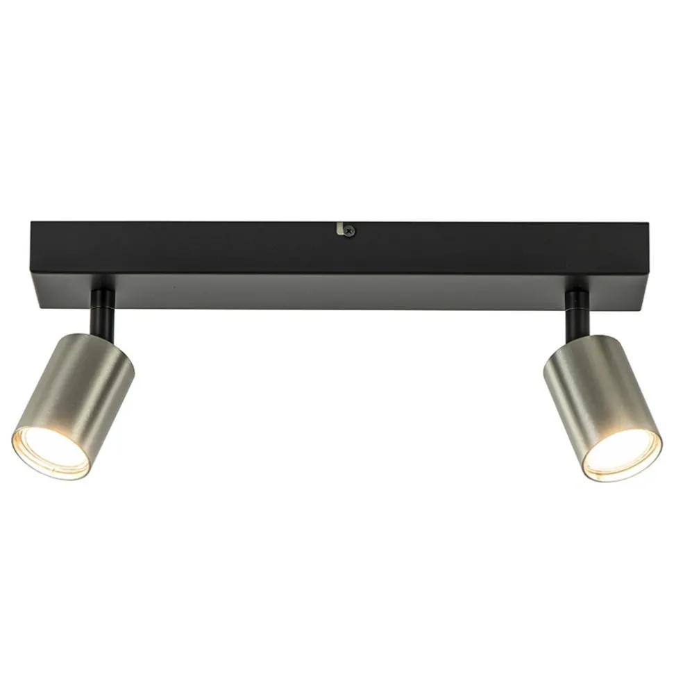 Een fijne toevoeging voor een hal, woonkamer of slaapkamer. De 2-lichts plafondspot heeft een mooie afwerking die is uitgevoerd in het mat zwart met RVS. Deze combinatie maakt de plafondlamp modern en strak tegelijk. De twee cilindervormige spots zijn naar wens te verstellen door deze te draaien en/of te kantelen. Ideaal om zo een ruimte goed uit te lichten. De mat zwarte plafondbalk heeft een lengte van 40 cm en is 8 cm breed. De moderne opbouwspot is dimbaar middels een externe dimmer en wordt geleverd exclusief lichtbron (2x GU10).