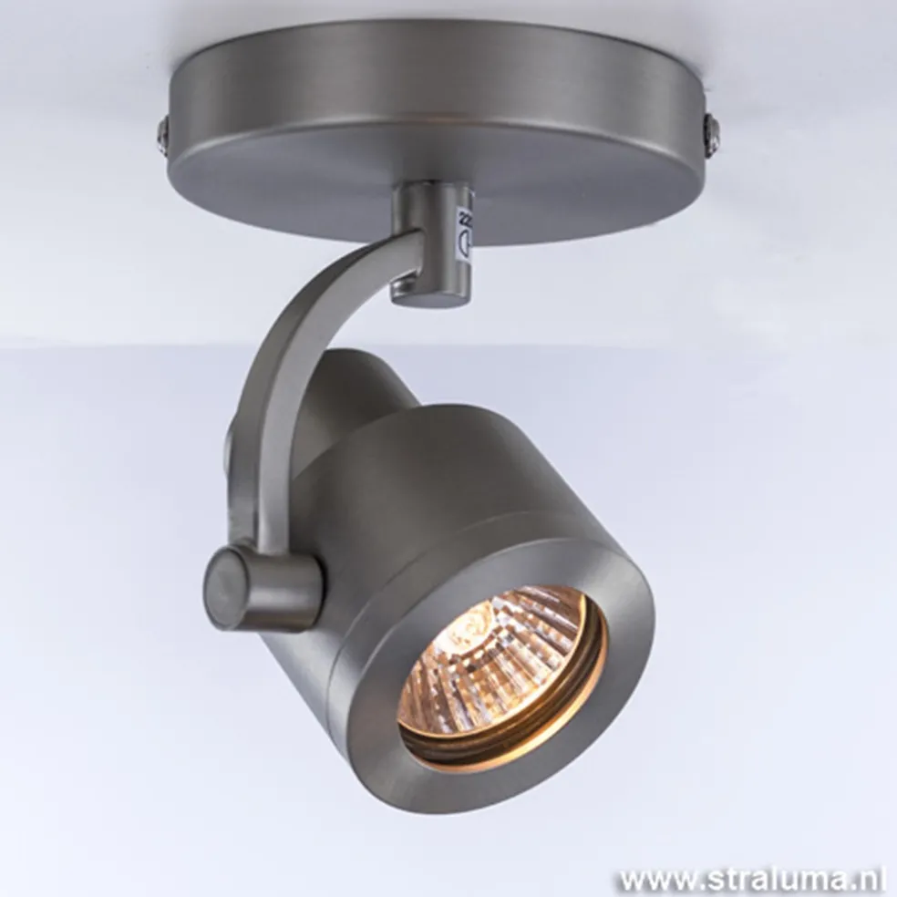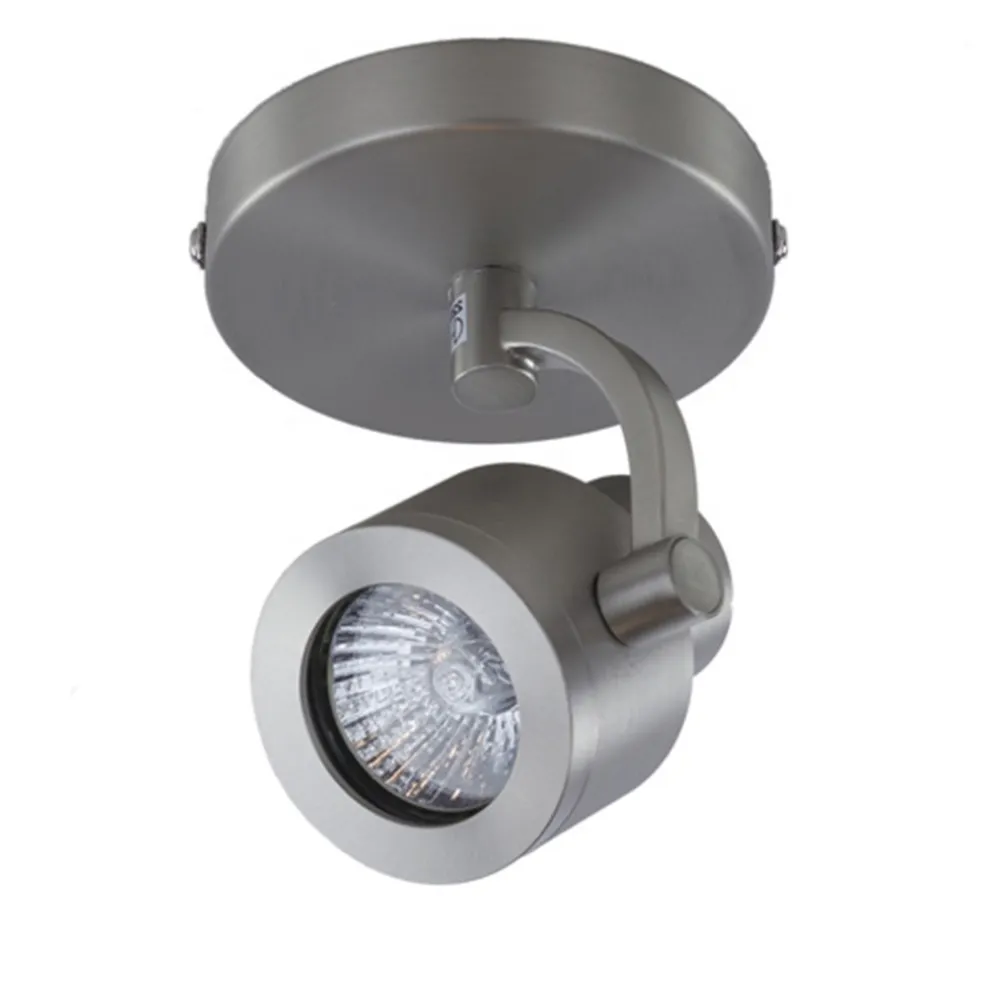Een kleine, strak uitgevoerde plafondspot. Ideaal voor het toilet of in een kleine hal. Deze opbouwspot is kantel- en draaibaar en dus zeer goed te richten. Volledig uitgevoerd in mat nikkel (staal). De plafondlamp staal past mooi in een modern interieur en kan ook prima dienst doen voor het uitlichten van objecten of schilderijen.