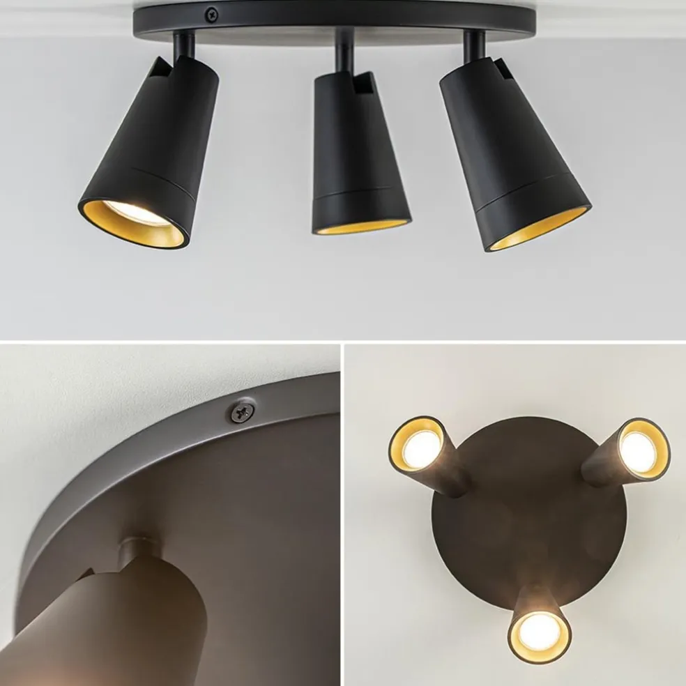 Perfect voor uw woonkamer, keuken of slaapkamer. Deze 3-lichts opbouwspot is verstelbaar door de spots te draaien of kantelen zodat u deze altijd naar de juiste richting kunt plaatsen. De opbouwspot is volledig van metaal en voorzien van een mat zwarte finish. Leuk accent is de gouden binnenzijde van de ring. De combinatie van het zwart en goud maakt de opbouwspot ook prima geschikt voor diverse woonstijlen. U kunt de GU10 lichtbronnen gemakkelijk plaatsen door de bovenzijde van de spots los te draaien. De lichtbronnen zijn niet inbegrepen. De 3-lichts plafondlamp is dimbaar met de juiste dimmer (exclusief).
