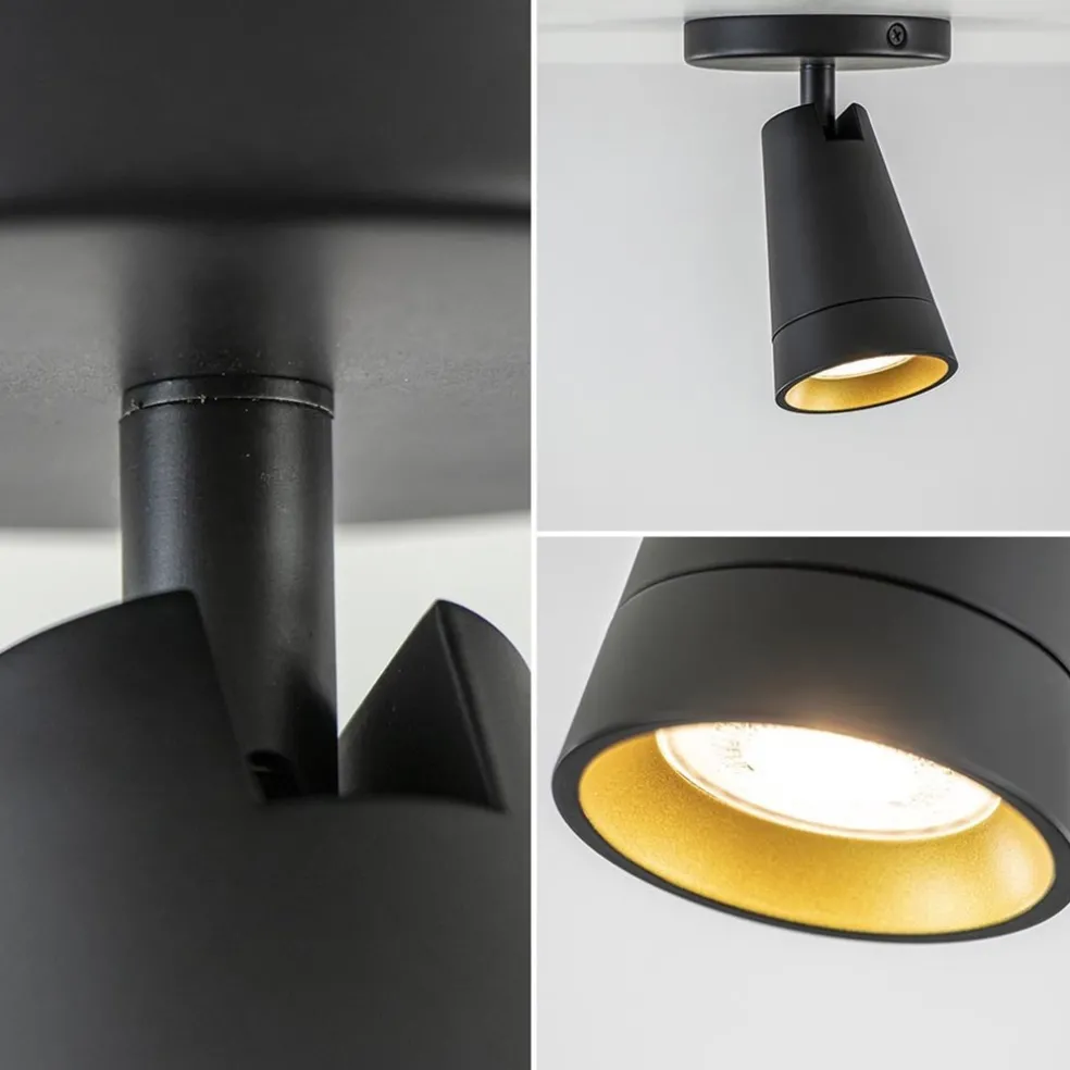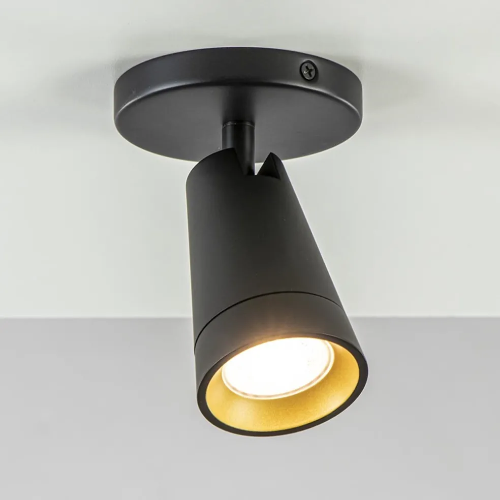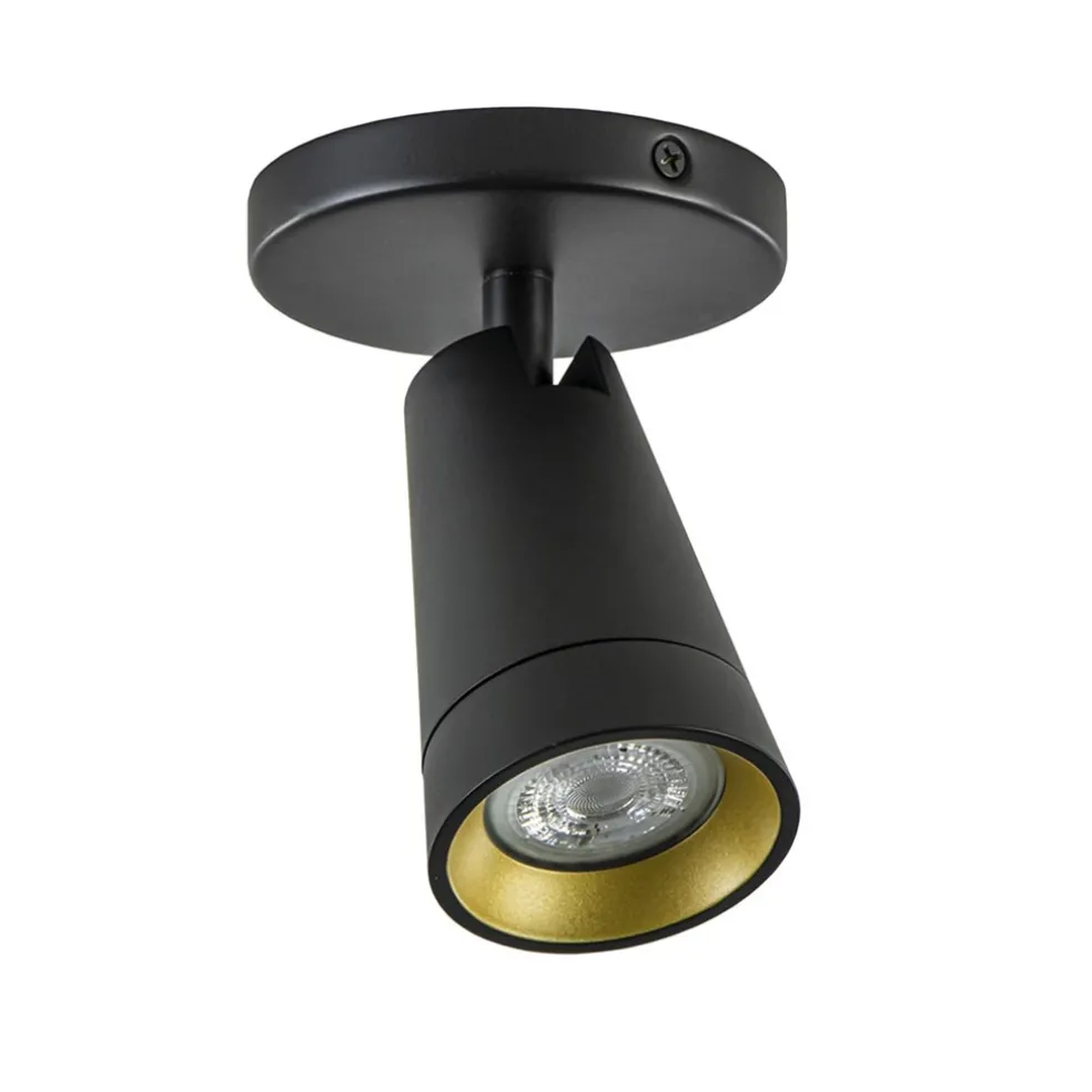 Wilt u net even die donkere hoek of een schilderij uitlichten? Dan is dit een ideale spot om toe te passen. De plafondspot is verstelbaar door deze te draaien of kantelen zodat u deze altijd naar de juiste richting kunt plaatsen. De opbouwspot is volledig van metaal en voorzien van een mat zwarte finish. Leuk accent is de gouden binnenzijde van de ring. De combinatie van het zwart en goud maakt de opbouwspot ook prima geschikt voor diverse woonstijlen. U kunt de GU10 lichtbron gemakkelijk plaatsen door de bovenzijde van de spot los te draaien. De lichtbron is niet inbegrepen. De enkele plafondlamp is dimbaar met de juiste dimmer (exclusief).