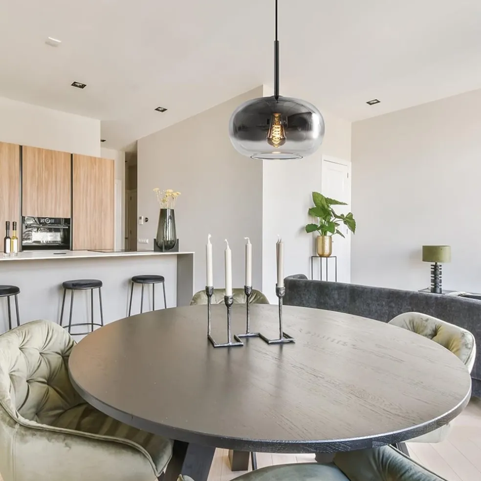 Met dit prachtige glas maakt u een mooi statement in uw woning. Het glas is voorzien van een gradient, oftewel verloop, van smoke naar helder. Dit geeft de kap een luxe uitstraling die wordt versterkt door het spiegelende effect in het smoke gedeelte. De ronde kap heeft een doorsnede van 31 cm en wordt bevestigd op een mat zwarte metalen pendel. De hoogte van de 1-lichts hanglamp is 170 cm en is naar wens in te korten. Zo kan de smoke glazen hanglamp worden toegepast in een ruimte als de woonkamer, hal en slaapkamer. De ronde hanglamp is dimbaar middels een externe dimmer en wordt geleverd exclusief lichtbron (E27).