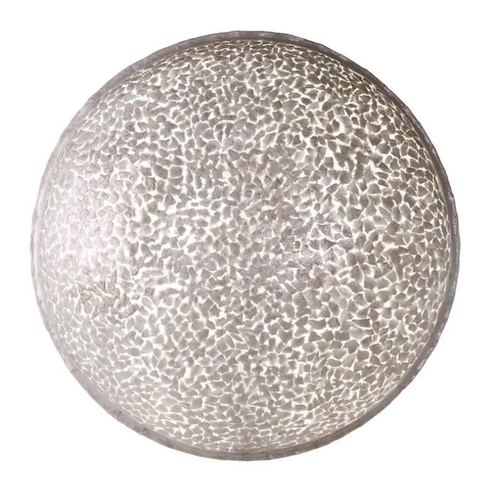 Een mooie decoratieve toevoeging aan het interieur. Deze grote wandlamp is een echte eye-catcher en sfeermaker ineen. De grote kap is gemaakt van gebroken stukjes capiz schelpen die in een fiberglas mal zijn gelegd. De schelpen zorgen voor een sfeervol effect wanneer de lamp is ingeschakeld. Door de witte/parelmoer schelpen krijgt de wandlamp een frisse moderne uitstraling. De schelpen kap is bevestigd op een wit metalen frame waarmee u de lamp gemakkelijk op een schroef of spijker kunt ophangen. Het witte frame zorgt ervoor dat de kap zo’n 5 cm van de muur af staat zodat er langs de muur een mooie lichtverspreiding plaats kan vinden. De grote wandlamp is voorzien van een wit snoer van 170 cm, met een schakelaar op 55 cm van de lamp. De schelpen wandlamp wordt geleverd zonder lichtbron (2x E14).
