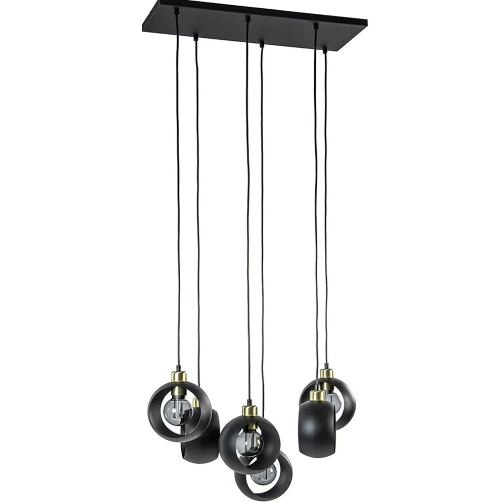 Een uniek design met een speelse look. Deze 6-lichts hanglamp is een mooie toevoeging aan het interieur en past in diverse woonstijlen. De hanglamp is voorzien van 6 kappen die bestaan uit een brede mat zwarte ring en een gouden fitting. De ringen hangen los op de fitting zodat u deze gemakkelijk naar wens kunt draaien. De zwart met gouden hanglamp is op diverse manieren op te hangen. Zo kunt u de kappen clusteren maar ook laten verspringen door ze op diverse hoogtes te hangen. De speelse hanglamp wordt aan het plafond bevestigd met een zwart metalen plaat van 60×20 cm. Deze 6-lichts hanglamp zwart met goud wordt geleverd zonder lichtbron (E27).