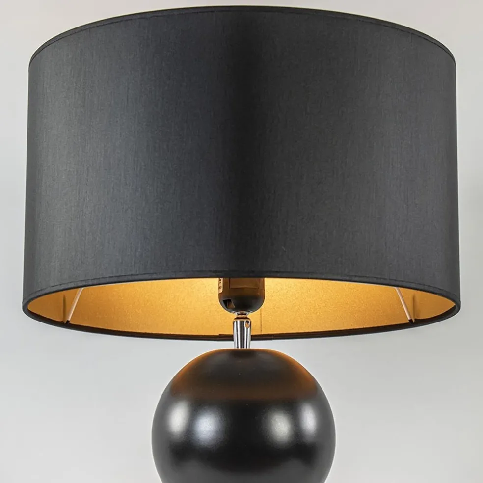 Een elegante toevoeging voor een strak klassiek of hotel chic interieur. De lampvoet is volledig gemaakt van keramiek en is uitgevoerd in het mat zwart. Dit geeft de tafellamp een luxe uitstraling die compleet wordt gemaakt door de ronde kap in het zwart/goud. Deze wordt ondersteund door een fitting met kogelgewricht zodat u de kap gemakkelijk recht kunt zetten. De tafellamp met bollen is voorzien van een zwart snoer met een lengte van 140 cm. De schakelaar bevindt zich op 20 cm van de voet. De chique tafellamp met kap wordt exclusief lichtbron geleverd.