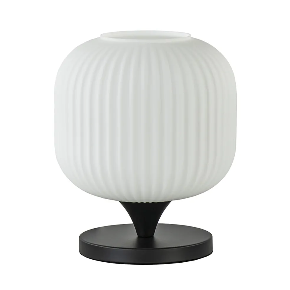 Deze tafellamp is een leuke toevoeging aan het interieur. Door het lage voetje kan de tafellamp op diverse plekken worden toegepast als het dressoir, in een kast of zelfs op het nachtkastje. Het voetje is gemaakt van metaal en uitgevoerd in het mat zwart. Deze ondersteund de mat witte glazen kap met reliëf. Dit geeft de tafellamp een retro look die mooi matcht in diverse stijlen. De tafellamp is voorzien van een zwart snoer met een lengte van 180 cm en wordt geleverd exclusief lichtbron.