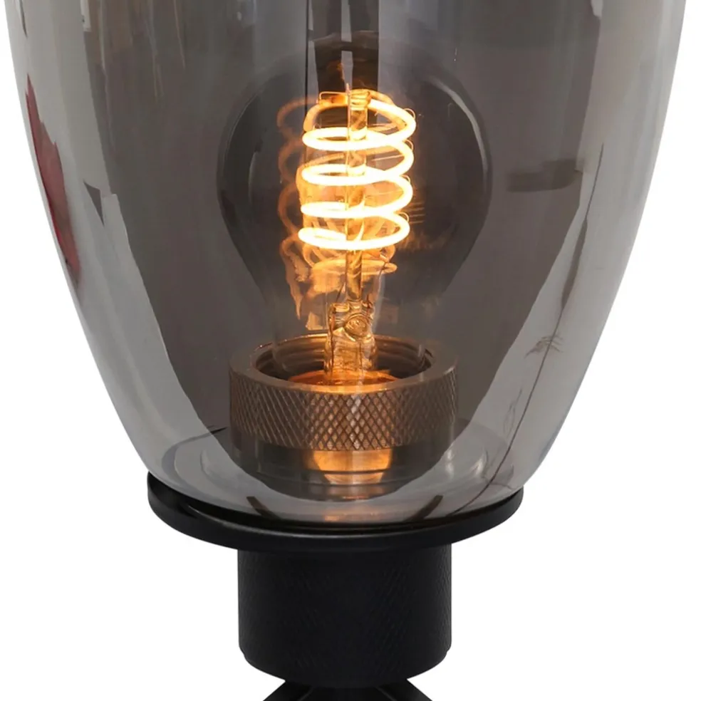 Een tafellamp uit een mooie serie. De zwarte tafellamp is voorzien van een driepoot voet met een zwarte fitting die de ovale kap ondersteund. De kap is gemaakt van donker spiegeld glas, oftewel smoke glas. Het donkere glas heeft een titanium look die de lamp een luxe uitstraling geeft. Het glas spiegeld wanneer de lamp is uitgeschakeld, schakelt u de lamp in dan kleur het glas donker transparant. De driepoot voet heeft een zwart stofomwonden snoer met een lengte van 150 cm en is voorzien van een knipschakelaar. De smoke glazen tafellamp wordt geleverd zonder lichtbron (E27).
