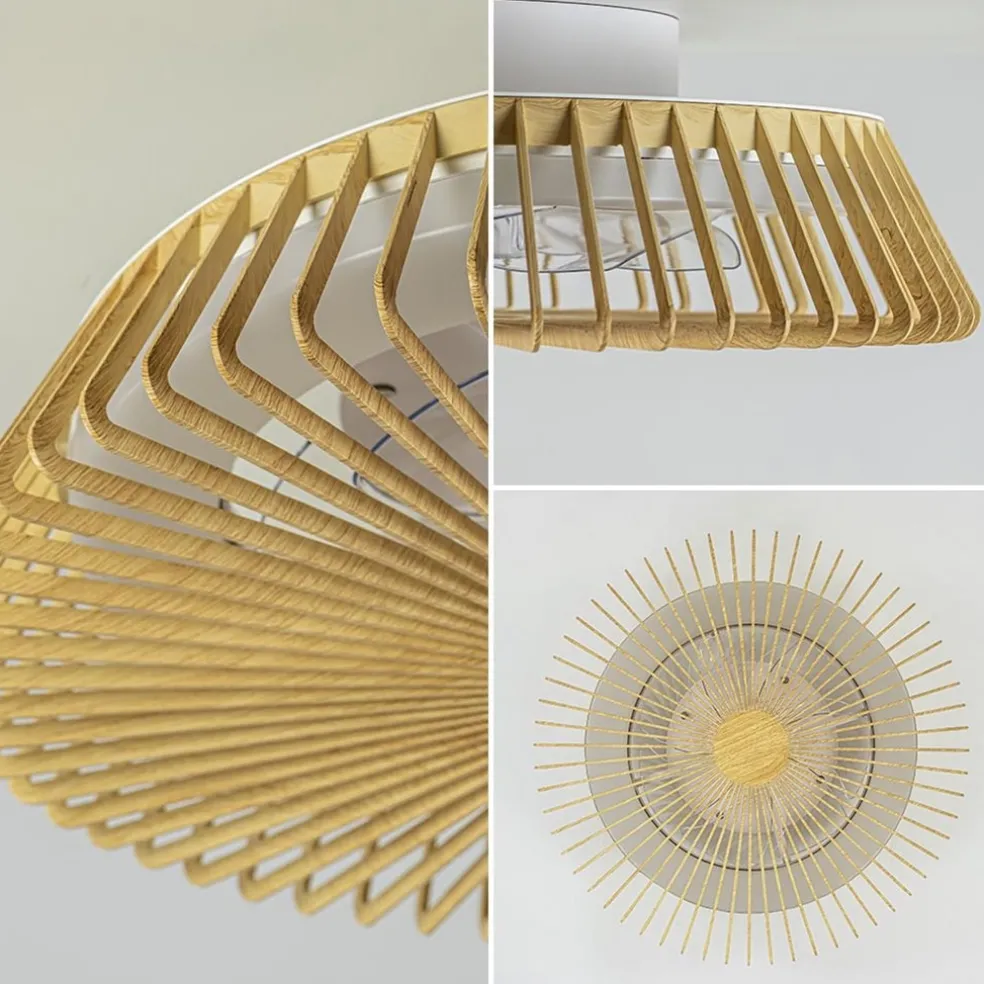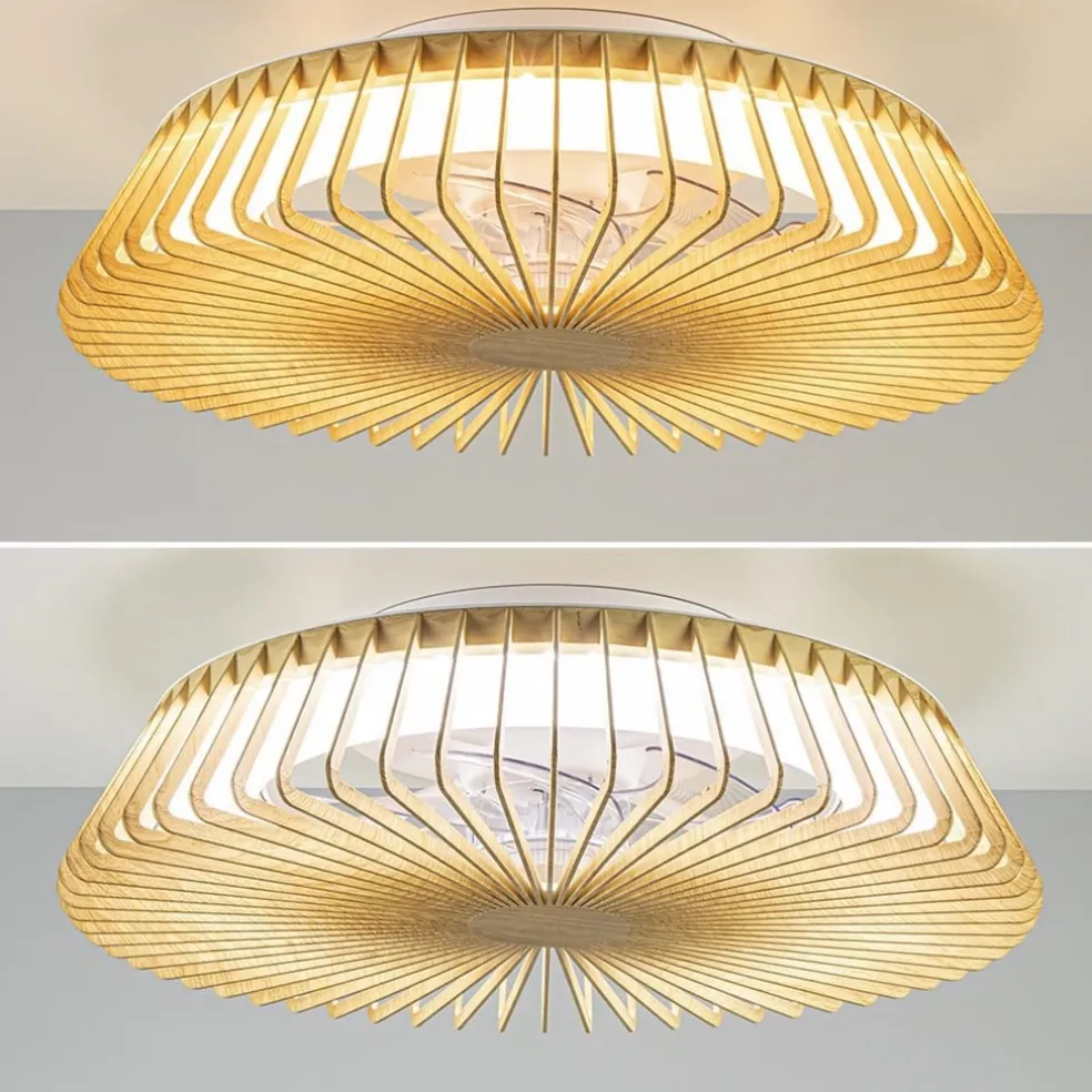 Een moderne design plafondventilator met LED zoals we deze nog niet eerder hebben gezien. De ronde ventilator oogt meer als een plafondlamp dan een ventilator maar deze heeft beide functies in één. De fraaie kap met hout-look geeft de plafondventilator een frisse uitstraling. De moderne plafondventilator, met ledlichtbron, is voorzien van diverse functies. Zo kunt u de kleurtemperatuur kiezen tussen de 2700 en 5000 Kelvin en kunt u de lamp eenvoudig dimmen. Dit bediend u allemaal gemakkelijk met de bijgeleverde afstandsbediening of via een app op uw mobiele telefoon. Deze verbindt u d.m.v. Bluetooth met de lamp zodat u vanaf uw bank, bed of luie stoel snel de gewenste instelling kunt maken. Kortom, een ideale plafondlamp en ventilator in één met een mooie design uitstraling.