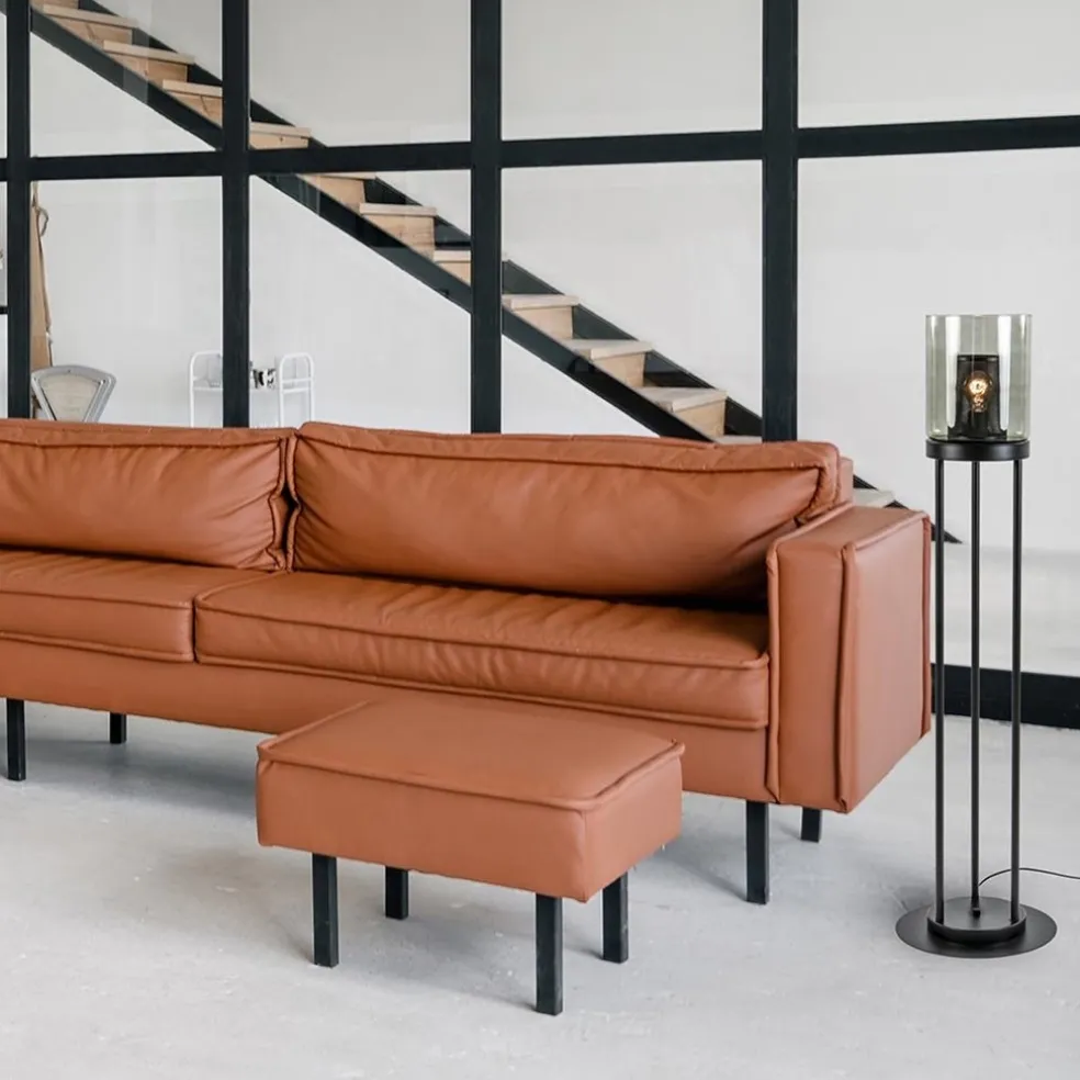 Modern, chique en industrieel in één. Deze vloerlamp past gemakkelijk in diverse woonstijlen. Het mat zwarte armatuur geeft de lamp een robuuste uistraling die wordt versterkt door de gaas cilinder binnenin het glas. Het smoke glas geeft daarentegen een chique look aan de lamp. Leuk aan de lamp is dat deze ook zonder de zwarte cilinder kan worden gebruikt. Deze wordt standaard meegeleverd maar u kunt zelf kiezen wat u mooier vind. De staande lamp is voorzien van een zwart snoer met een lengte van 220 cm, welke is voorzien van een voetschakelaar op 85 cm van de lamp. De mat zwarte vloerlamp met smoke glas wordt geleverd zonder lichtbron (E27).