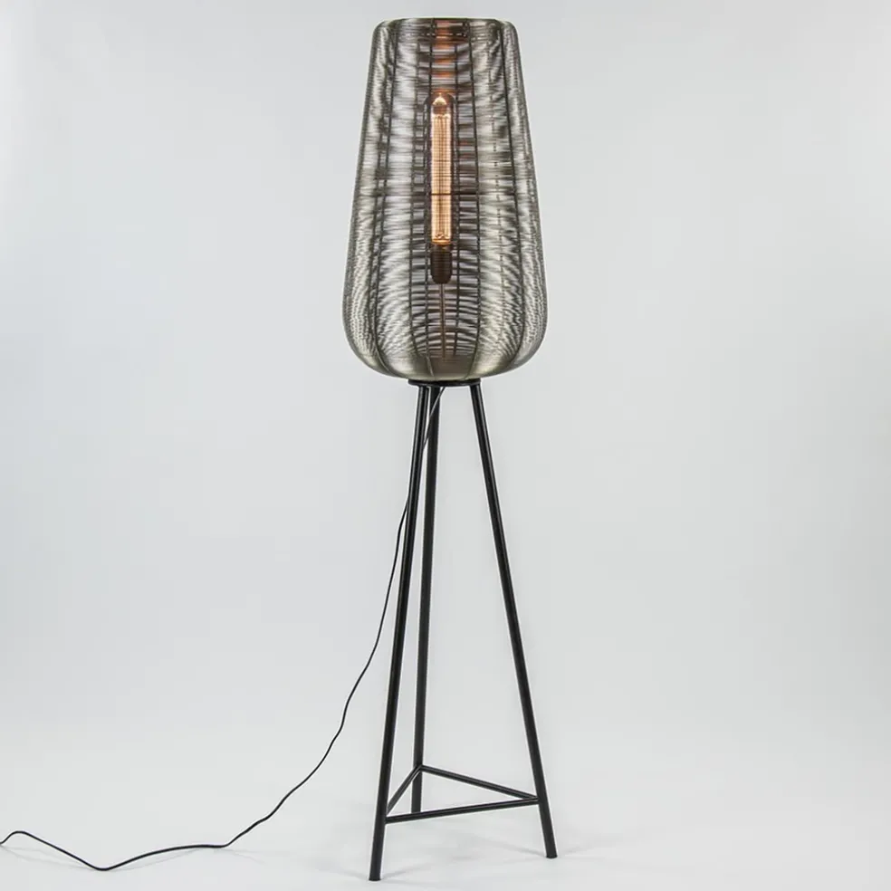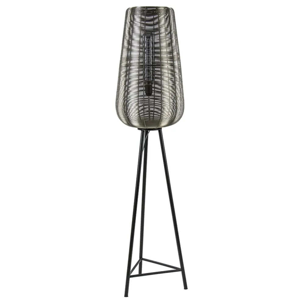Scandinavisch, klassiek en modern in één. Vloerlamp Adeta is van meerdere markten thuis. De mat zwarte vloerlamp is voorzien van een grote nikkel draadkap die wordt ondersteund door een driepoot. De grote kap biedt ruimte voor een grote decoratieve lichtbron zoals ook op de foto’s zichtbaar is. De staande draadlamp heeft een zwart snoer met een lengte van 310 cm, waarbij de schakelaar zich op 180 cm van de lamp bevindt. De vloerlamp Adeta wordt geleverd zonder lichtbron (E27).